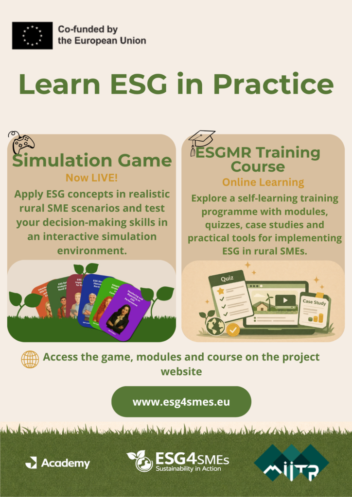 Ανακαλύψτε τους μαθησιακούς πόρους της ESG4SMEs 🌱 Η μάθηση σχετικά με την ESG δεν χρειάζεται να είναι στεγνή, περίπλοκη ή συντριπτική. Στο πλαίσιο του έργου ESG4SMEs, έχουμε αναπτύξει δύο πρακτικούς και ελκυστικούς πόρους που καθιστούν τη μάθηση του ESG πιο προσιτή, διαδραστική και σχετική για τις αγροτικές...